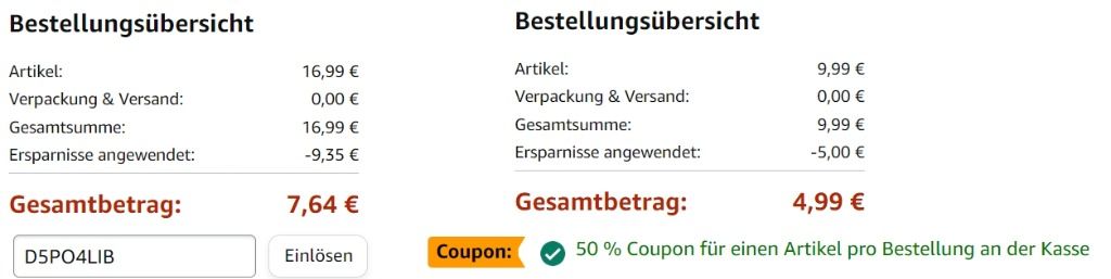 Schwenken wir noch einmal rüber zu Amazon, denn dort sind zwei Produkte dank Gutschein Aktionen reduziert. Unter 39€ Bestellwert fallen ohne Prime Mitgliedschaft noch 3,99€ Versandkosten an, welche ihr mit einer Lieferung an eine Abholstation umgehen könnt.