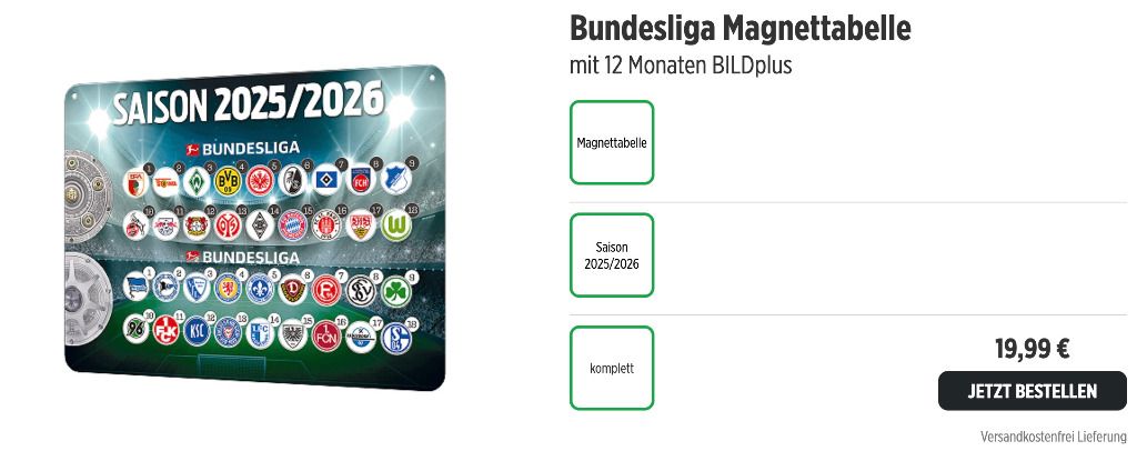 Gerade entdeckt und für gut befunden. Ihr bekommt nun 1 Jahr BILDplus im Abo für nur 19,99€. Oben drauf bekommt ihr aber auch noch eine BILDplus Magnettabelle (Saison 2025/2026).