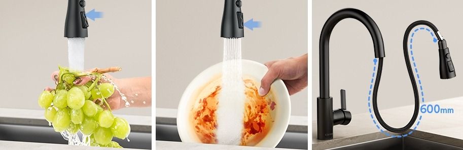 Einfaches Spülen in der Küche: Die COREE Wasserhahn Küche verfügt über einen 360° schwenkbaren ausziehbaren Sprühkopf mit 2 Sprühmodi und einer Pausentaste. Aktivieren Sie den Hochdruck-Reinigungssprühkopf per Knopfdruck zum Spülen von Töpfen und Pfannen. Sparen Sie Wasser mit der Pause-Taste