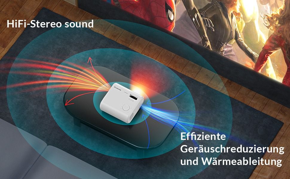 Der Mini-Projektor verfügt über eine Helligkeit von 17000 Lux und unterstützt 30–180 Zoll Full HD 1080P-Bildschirme (empfohlen für 60–100 Zoll Bildschirme), wobei er fortschrittliche LED-Technologie und eine gleichmäßige Beleuchtungsmethode verwendet, die die Kanten der Projektion hervorhebt heller und klarer. . Diese sorgen dafür, dass die Qualität des Projektionsbildes eine echte, dynamische und farbintensive Wirkung hat. Der Miniprojektor verfügt außerdem über eine diffuse Reflexionstechnologie, die Ihre Augen vor Ermüdung schützt.