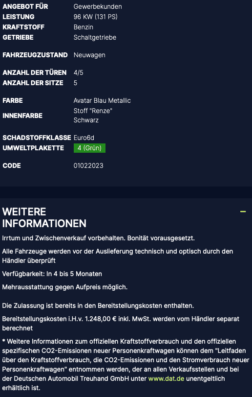 Die Bereitstellungskosten liegen bei 1.248€ und das Fahrzeug ist in 4-5 Monaten verfügbar. Der Leasing-Faktor liegt dementsprechend bei 0,28.