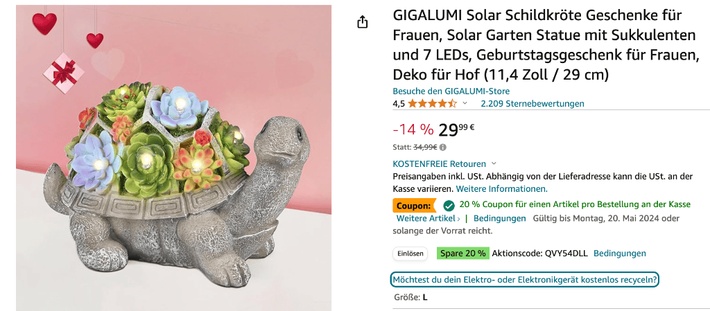 Bei Amazon verkauft man euch nun die Gigalumi Solar Schildkröte Statue mit Sukkulenten und 7 LEDs für 17,99€ inklusive des Prime Versand.