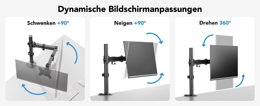 Ergonomische Flexibilität: Mit +/-90° Drehung, +/-90° Neigung und 360° Monitordrehung bietet dieser Monitorarm die ultimative Flexibilität bei der Betrachtung. Mit einer maximalen Höhe von 41cm für einen einzelnen Monitorständer können Sie Ihren Bildschirm dort positionieren, wo Sie ihn bequem haben möchten.