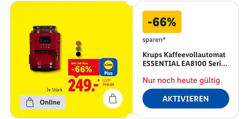 Im LIDL Onlineshop bekommt ihr gerade noch den hier gezeigten Krups Kaffeevollautomat Essential EA8155 für 254,95€ inklusive Versand. Aktiviert den entsprechenden Coupon der LIDL Plus App.