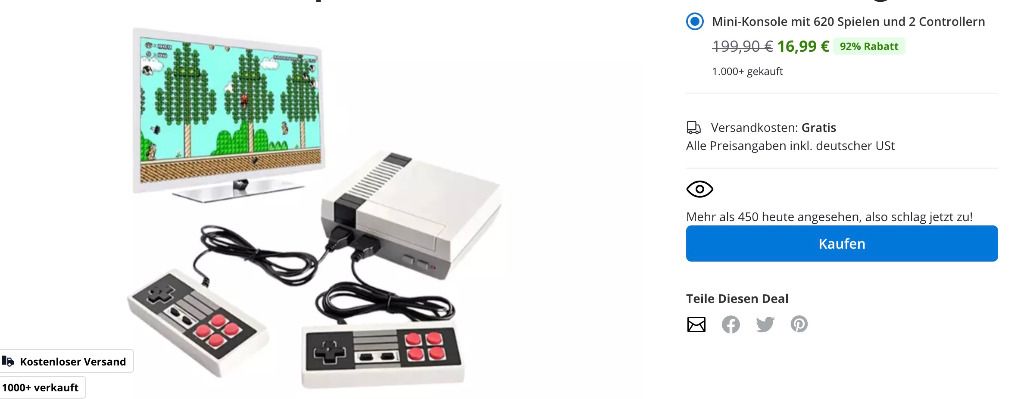 Über Groupon könnt ihr nun die Mini-Konsole mit 620 Spielen und 2 Controllern für 15,29€ inklusive der Versandkosten bestellen. Beachtet, dass der Versand aus Italien erfolgt. Die Lieferzeit wird mit 5 Werktagen angegeben. Nutzt den Code: FLASH.