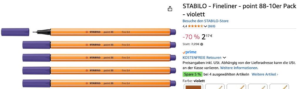 Mal in einer anderen Farbe, aber wohl selbiger Preisfehler... Vor ein paar Tagen verkaufte Amazon das 10er Pack Stabilo Fineliner (point 88 in violett) bereits für 2,17€ inklusive Prime Versand und jetzt sind sie wieder verfügbar.