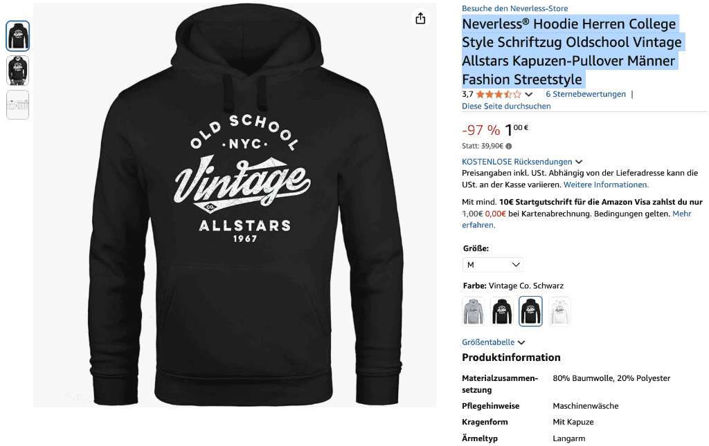 1€ für einen Hoodie. Mit Versand (1,90€) zahlt ihr hier insgesamt nur 2,90€. Preisfehler?