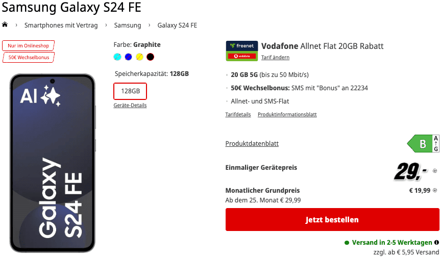 Wir schauen rüber in die MediaMarkt Tarifwelt, wo euch jetzt das Samsung Galaxy S24 FE 128GB zum einmaligen Hardwarepreis von 29€ zuzüglich 5,95€ Versandkosten angeboten wird.